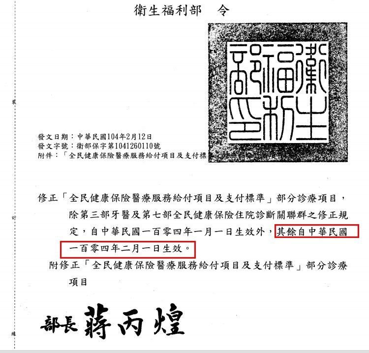 ![]() | [1] 衛部保字第1041260110號令.jpg (已被下載 369 次) [2] 醫療服務給付項目修正說明.jpg (已被下載 328 次) |