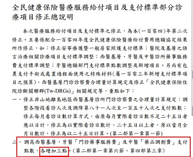 健保署於2月13日公告調高西醫基層、牙醫「門診藥事服務費」支付點數,各增加三點,並自一百零四年二月一日生效。